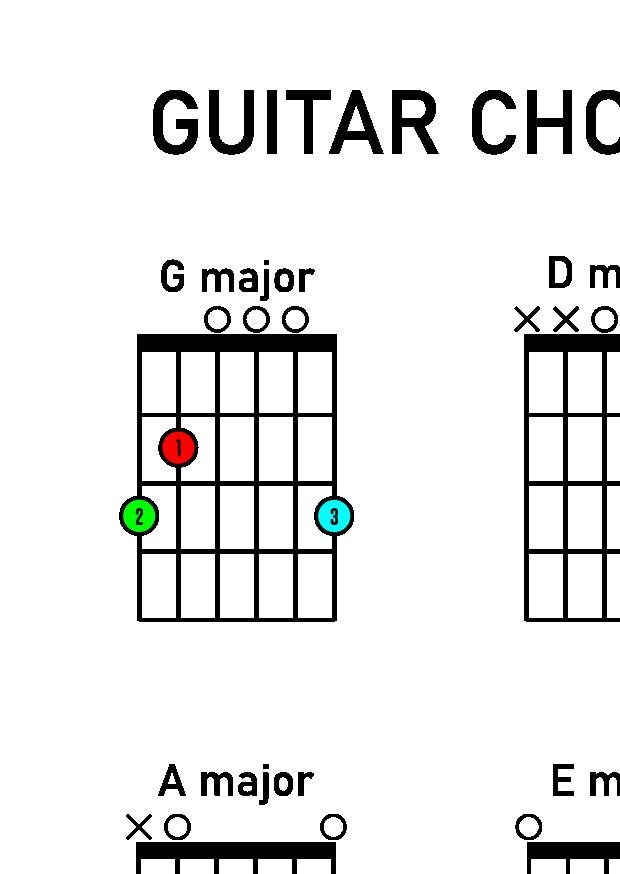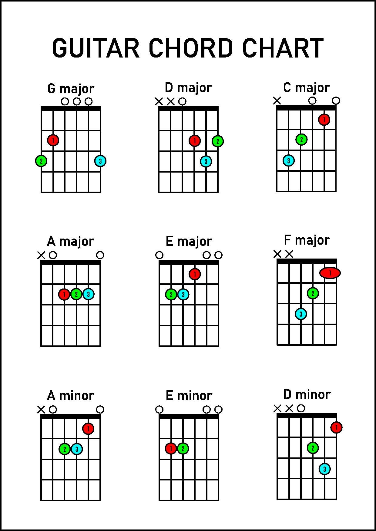 Guitar Chord Poster available in many sizes for instant download. Featuring the essential, 'bread-and-butter' chords you need to get going on the guitar in an easy to read display. Poster includes colour-coordinated left-hand finger guide. Suitable for beginner musicians or music teachers, great for a gift or a classroom resource.
